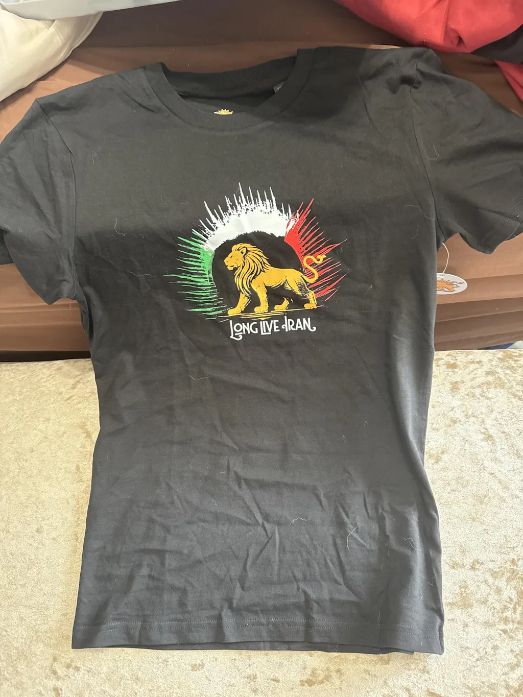 The lion, a symbol of strength and resilience. Behind it, the sun radiates in green, white, and red, reflecting the enduring spirit of Iran. Long live Iran.